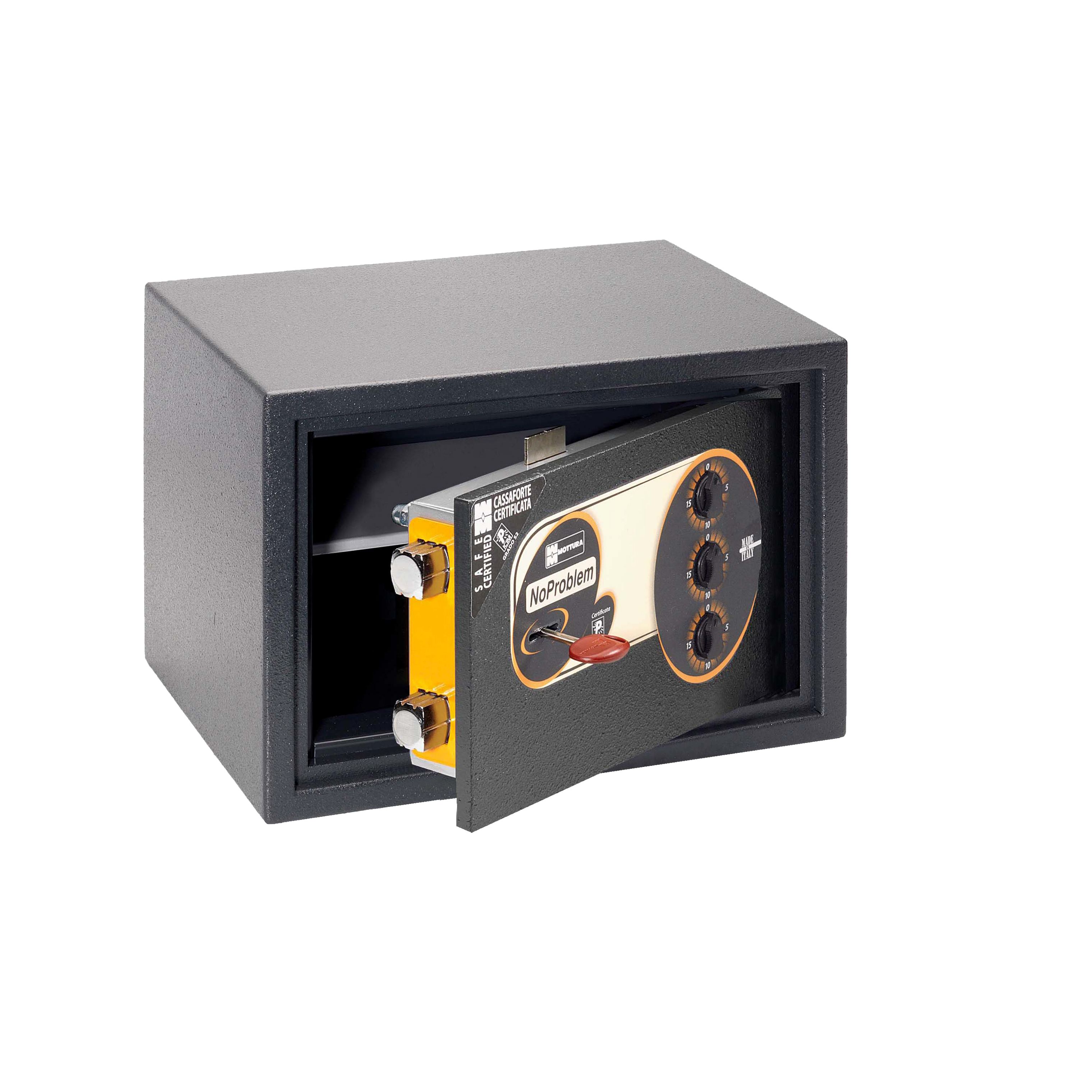 Le casseforti di sicurezza da mobile No Problem sono certificate secondo la norma UNI EN 14450. Presentano una protezione sul portello al manganese estesa ai chiavistelli frontali, uno spessore portello da 10mm e una cornice da 12mm. 3 strati di acciaio avvolgono completamente la cassaforte.