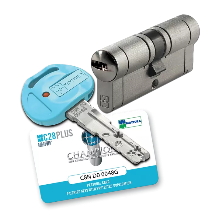 CHAMPIONS® C28PLUS abbina la cifratura a perni sagomati e un elemento mobile rotante (brevettato), che aumenta il livello di sicurezza in quanto ha funzione antidecodifica e contro il tentativo illecito di duplica della chiave.