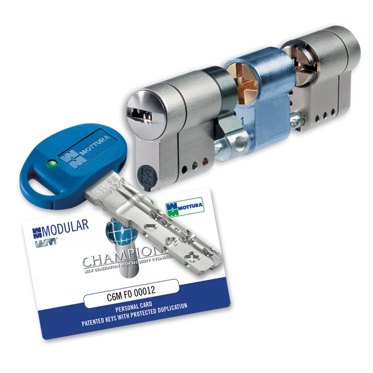 - CHAMPIONS® MODULAR oltre alla composizione, comprende cilindro, carta di proprietà, 3/5 chiavi, istruzioni di montaggio e vite di fissaggio. A garanzia della massima sicurezza le chiavi e la carta di proprietà sono sigillate all’origine.